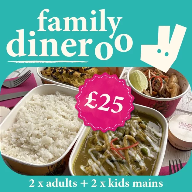 Tuck into a choice of bestselling mains for 2 adults + 2 kids for £25 only! Adults share one bigger portion – Family Sticky Chicken (or No Chicken) Bundle, Family Thai Curry Bundle or Family Spicy Bundle – while the kids enjoy 2 individual meals.